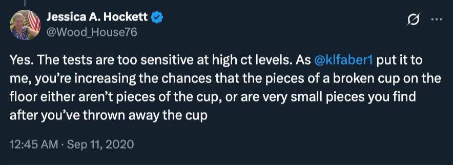 There are an ever changing palette of chemistries involved in the PCR, just read any Reddit board with PCR Lab technicians and they readily describe it as a “Dark Art” where you have to constantly tweak stuff to get the results you want. Compound this with the infinite variables of how the reagents are made in the first place and you have the opportunity to SCULPT the thing it is measuring.