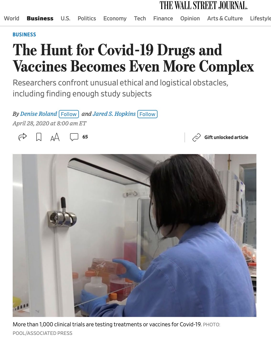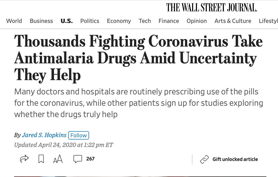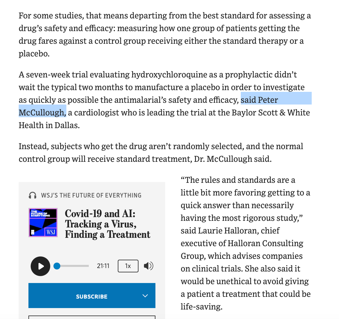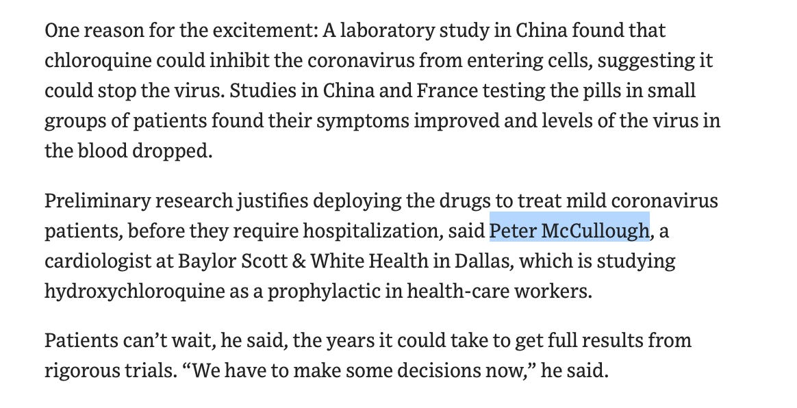 For example, McCullough was quoted in a April 24, 2020 Wall Street Journal article which also mentions Anthony Fauci.
