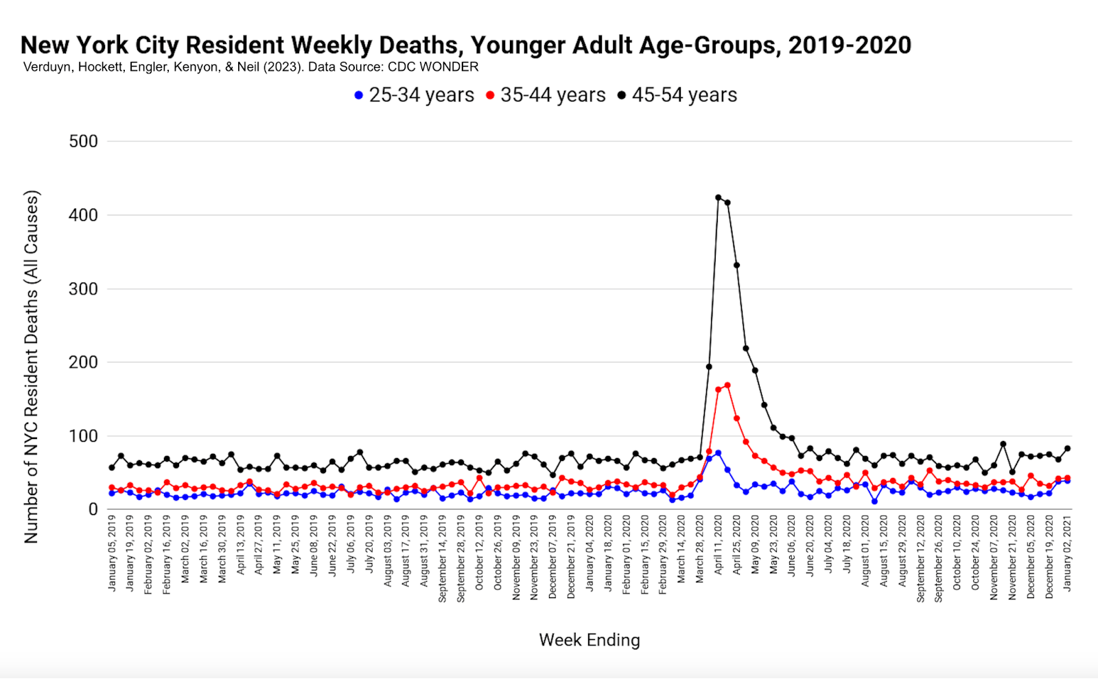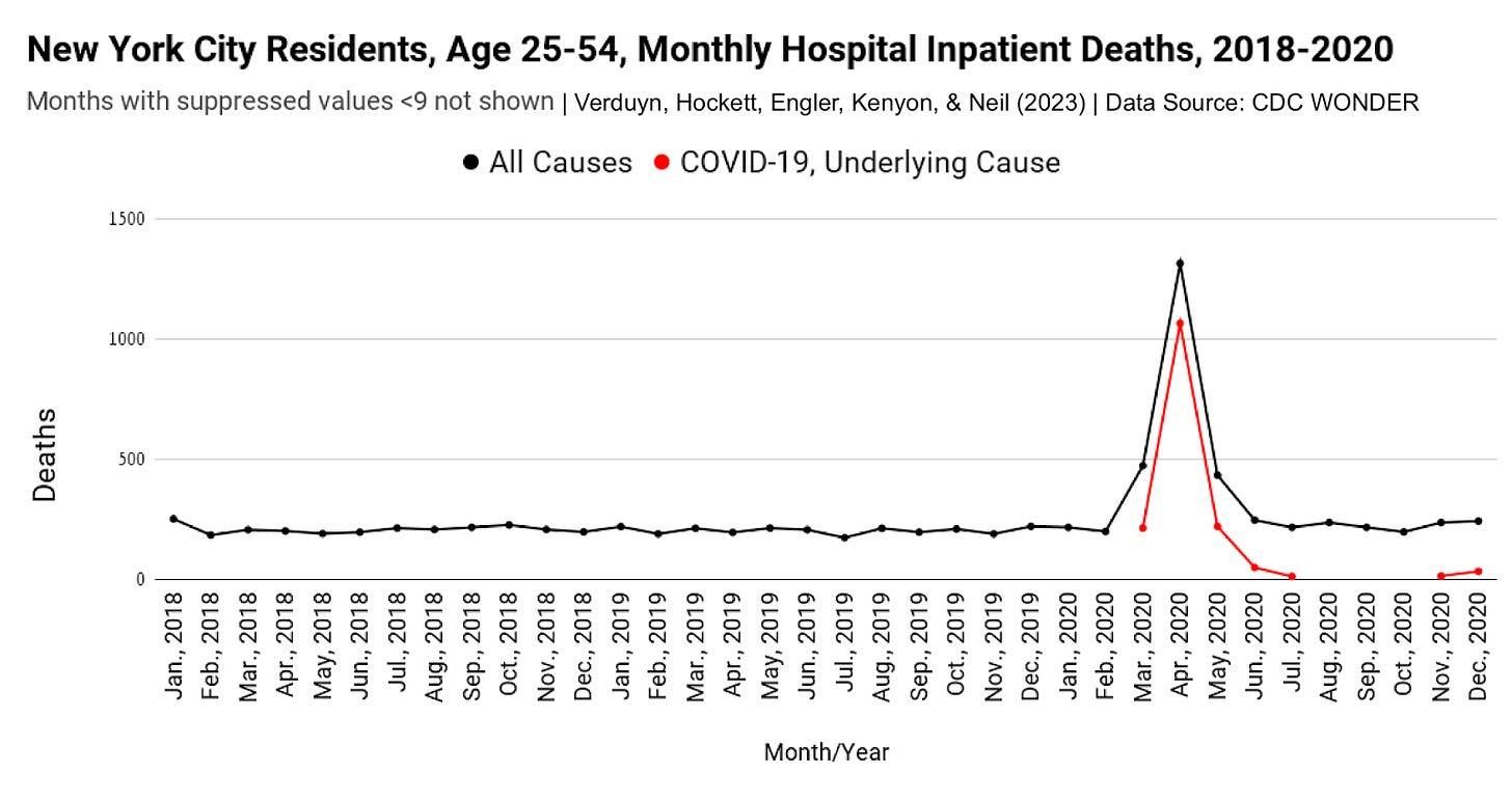 As far as colleagues in PANDA and I have been able to tell, New York City is a global outlier in the speed and magnitude of younger-adult deaths attributed to COVID-19. Nearly all the increase in hospital inpatient deaths among ages 25-54 cites COVID-19 as the underlying cause of death (figure 4).