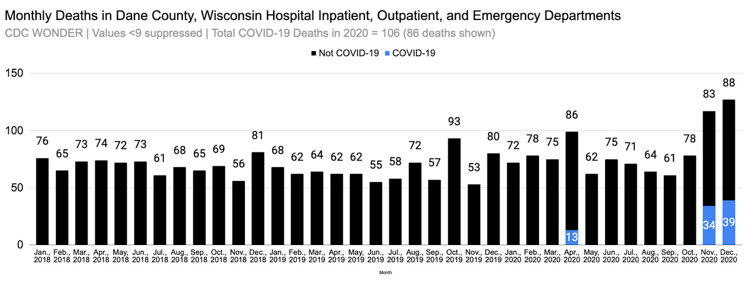 Federal data show that Dane County, Wisconsin, did not experience a significant increase in hospital deaths in spring 2020 – or a high number of COVID-19 deaths (figure 1). Do you recall how many deaths you observed that attributed COVID-19 as the underlying cause?