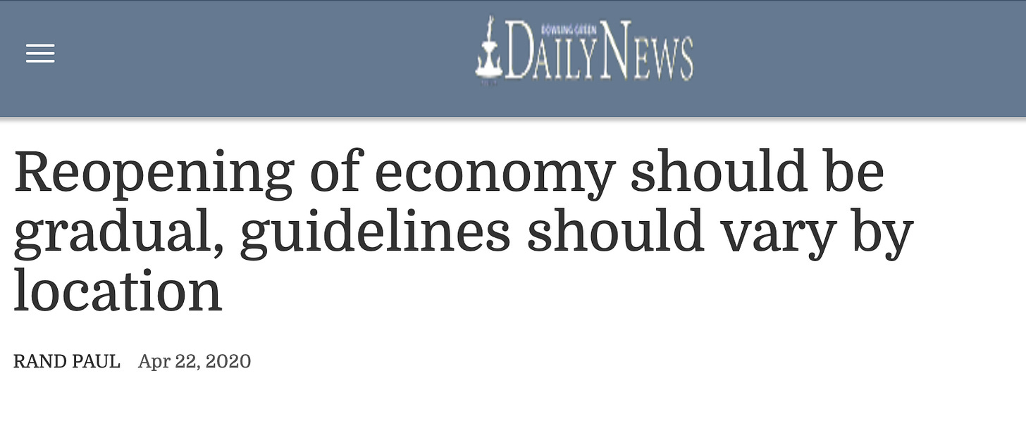 22 April 2020: Senator Paul publishes “Reopening of Economy Should be Gradual, Guidelines Should Vary by Location” (Bowling Green Daily News).
