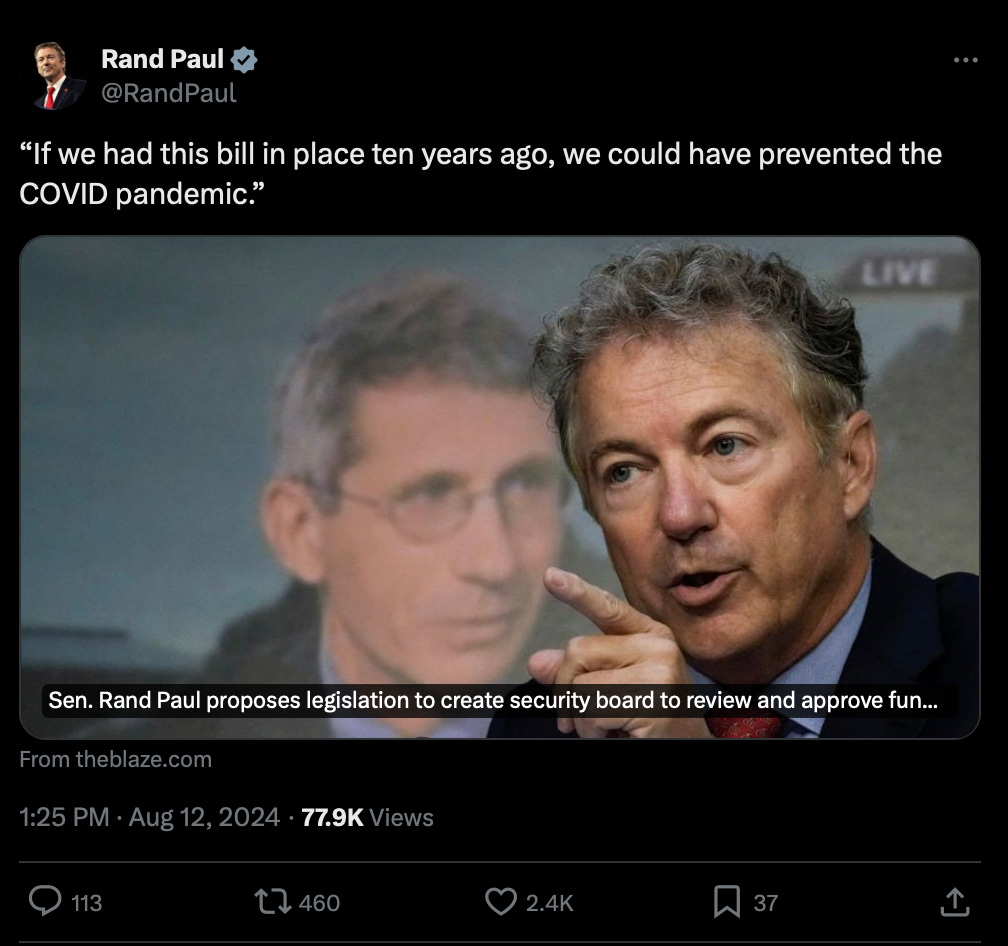 includes some of my views related to the nature/novelty of SARS-CoV-2, bioweapons, etc.A follower on X highlighted this August 2021 op-ed in which Senator Paul correctly refers to “crushing and overbearing lockdowns and mandates that were based on junk science.” What I don’t see is the Senator acknowledging the part he played in advocating those lockdowns and mandates. Moreover, his proposed amendment (eliminating the NIH director position) isn’t a solution to the lockdown/mandate problem.