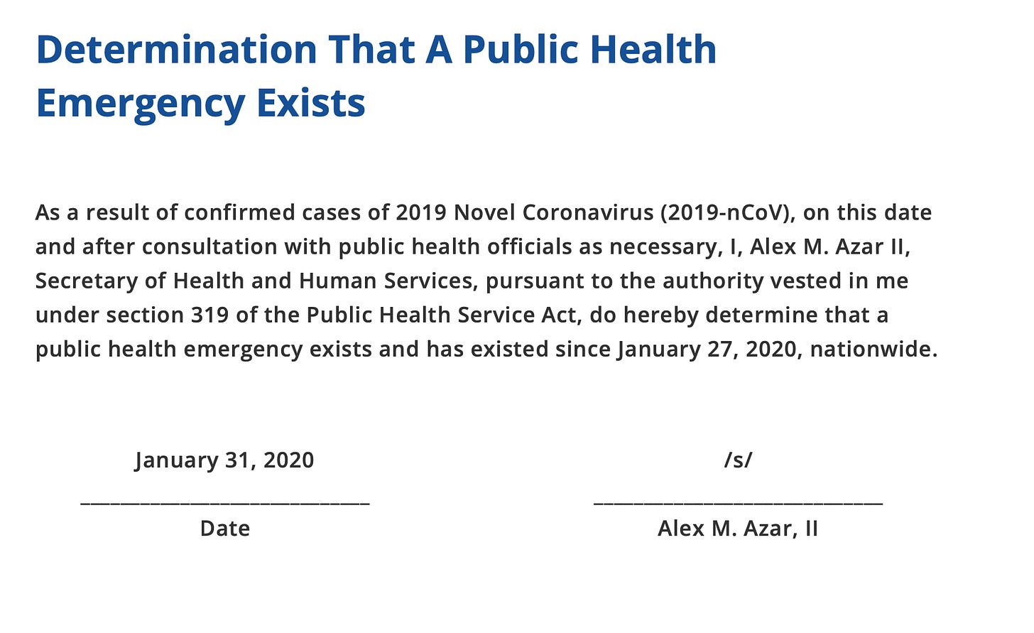 As a result of confirmed cases of 2019 Novel Coronavirus (2019-nCoV), on this date and after consultation with public health officials as necessary, I, Alex M. Azar II, Secretary of Health and Human Services, pursuant to the authority vested in me under section 319 of the Public Health Service Act, do hereby determine that a public health emergency exists and has existed since January 27, 2020, nationwide. (emphasis mine)