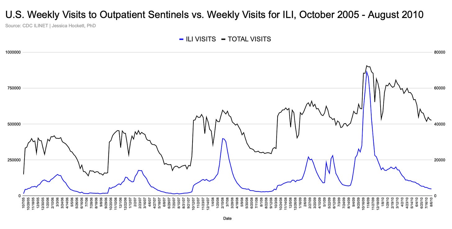 In this post, I’ll “set the stage” for the disappearance by showing that U.S. flu surveillance data are not wholly objective or unbiased measures of disease prevalence or severity. Long-term patterns and the events of the 2009 swine flu/H1N1 pandemic1 help illustrate some of the ways human behaviors and decisions impact the data that are collected and reported.