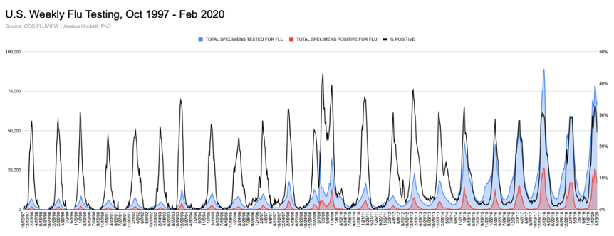 U.S. flu testing efforts increased considerably in two decades. Roughly 5,000 to 6,000 specimens tested by clinical and public health labs during peak season in 1997-1998 grew to nearly 90,000 tests in 2017-2018 (Figure 5). More testing has yielded a higher number of positive tests, with peak percent positivity between 30-40%8 (2009 is an exception I’ll explain in a bit.)