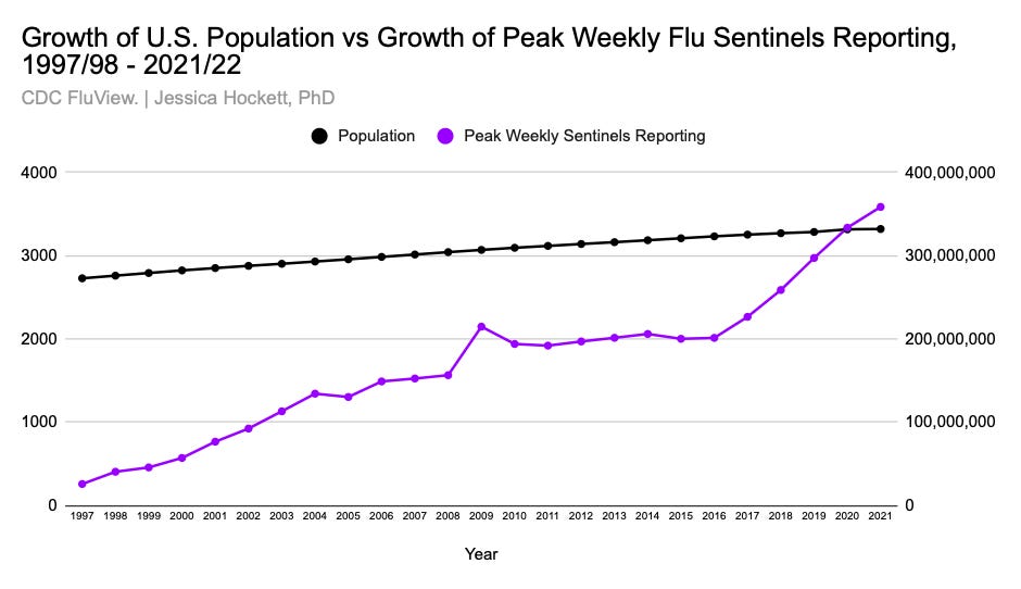 Whether and how “more” sentinels improves ILI as a surveillance tool - or saves lives and reduces disease burden - is unclear. (The evidence from influenza-attributed mortality, however, shows no evidence of decline in the past dozen years. If anything, there is an increase, which I discuss later in this post.)