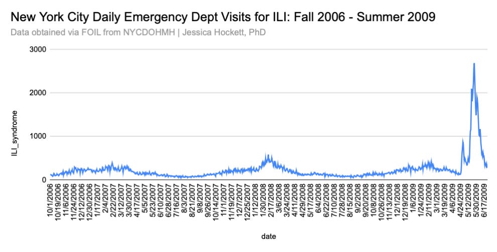 Announcements from government entities seem to have a big impact on ILI too. The 2008-09 season was nearly over when the WHO issued an emergency statement about swine flu. ILI visits shot up almost immediately (Figure 3). Daily emergency department ILI visits in New York City at the time show an even more dramatic spike (Figure 4).7