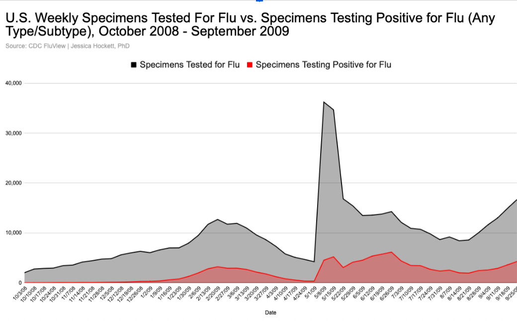 Virologic surveillance data for this period are comical.11 How does a version of flu fail to show up in ILI or the number of specimens tested, and then light up on the radar after people are told it’s on the scene? There is no plausible biological explanation for the explosion in positivity; it was driven by the test availability and testing. This is a big reason why, along with detection of the “novel” H1N1, we see increases in positivity of many other viruses in the flu stew (Figure 7).