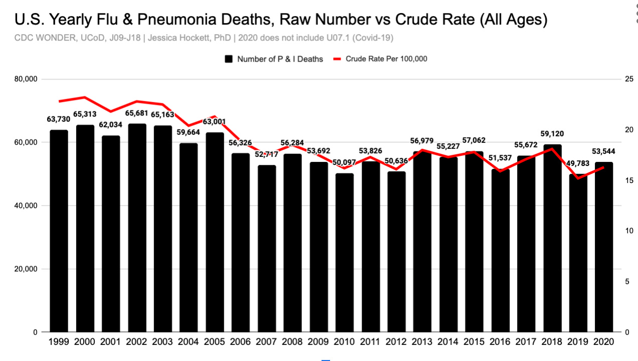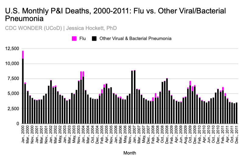 In recent decades, the CDC has combined deaths attributed to influenza per se with deaths attributed to pneumonia (regardless of causal agents) and called these “P & I” deaths. Like all deaths, these are associated with specific codes and coding guidance from the WHO International Classification of Diseases (ICD). The flu and pneumonia codes are located in the Diseases of the Respiratory System chapter. For now, I’ll refrain from explaining or debate the wisdom of the various codes. Suffice to say, there are different manifestations and causal or coincidental agents of pneumonia, one of which is influenza. Sometimes a virus or bacterium is identified for a pneumonia death; other times it is not.