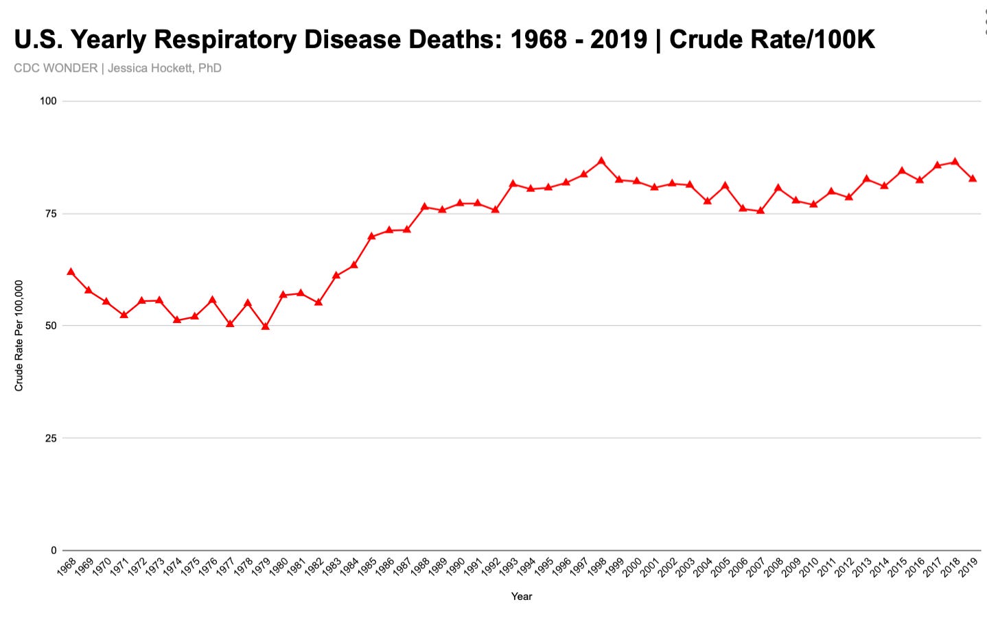 Federal data from 1968 - 2019 shows the crude rate of respiratory disease deaths (including P&I) in the U.S. rose in the early 1980s, peaked in 1998, and remained fairly steady thereafter (Figure 10).