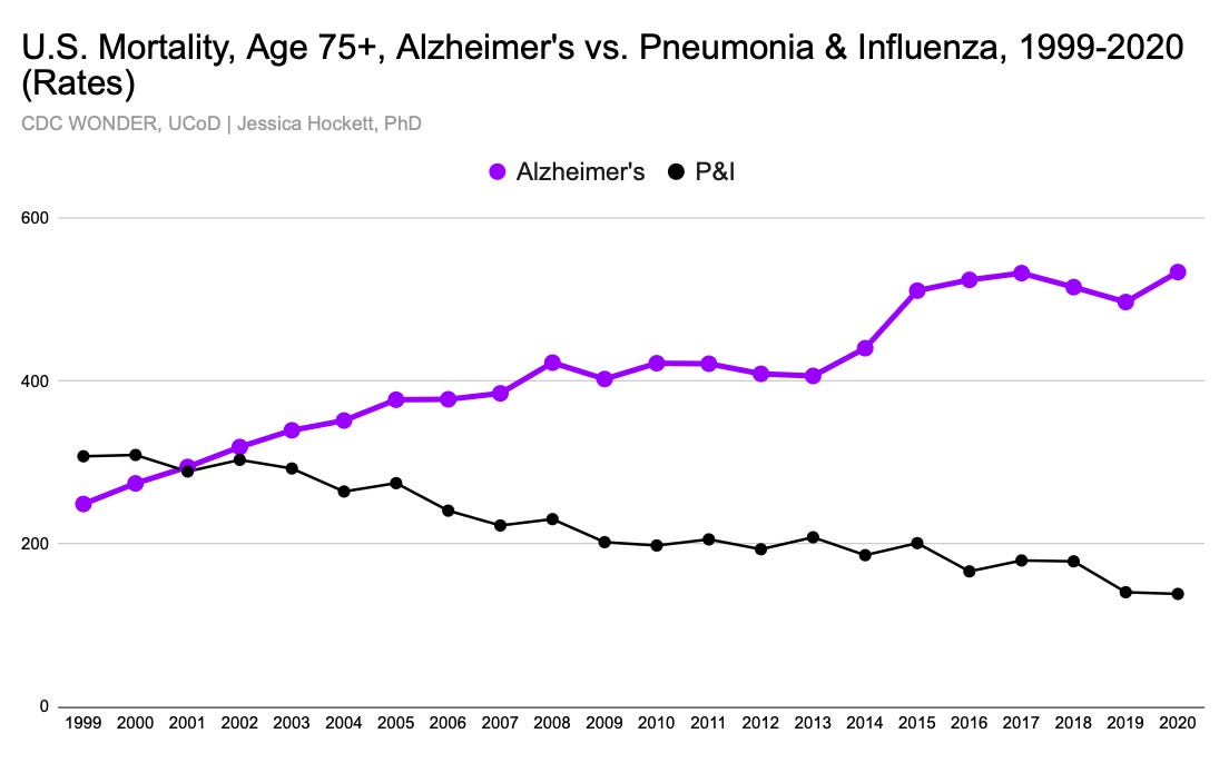 “Stole“ is my term, not the Society of Actuaries’ term. They say, “Some of the early increases [in the Alzheimer’s death rate for age 85+] may have been due to the increased attribution of deaths to Alzheimer’s, away from other CODs.”