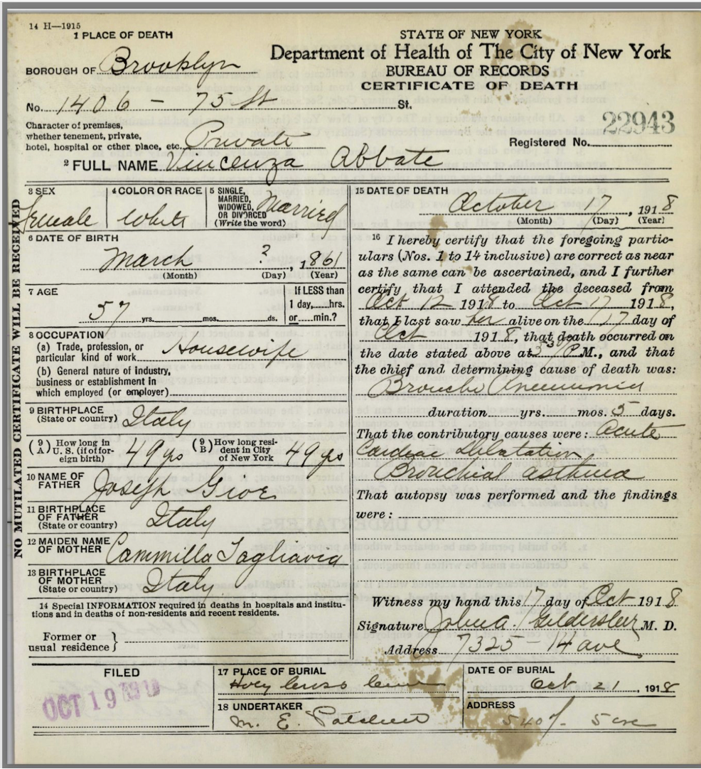 Public officials/staff are elected and appointed to steward those records on behalf of We the People. Using the New York death certificate above, why would the fact that Vincenza Abbate died at age 57 in Brooklyn on October 17, 1918 need to be a secret? Presumably, those who knew her knew she died. I wouldn’t characterize the causes to which the doctor attributed Vincenza’s death “private medical information”. It’s in the public’s interest to know that the doctor determined she died from bronchiolar pneumonia, with acute cardiac dilation and bronchial asthma as contributory causes.