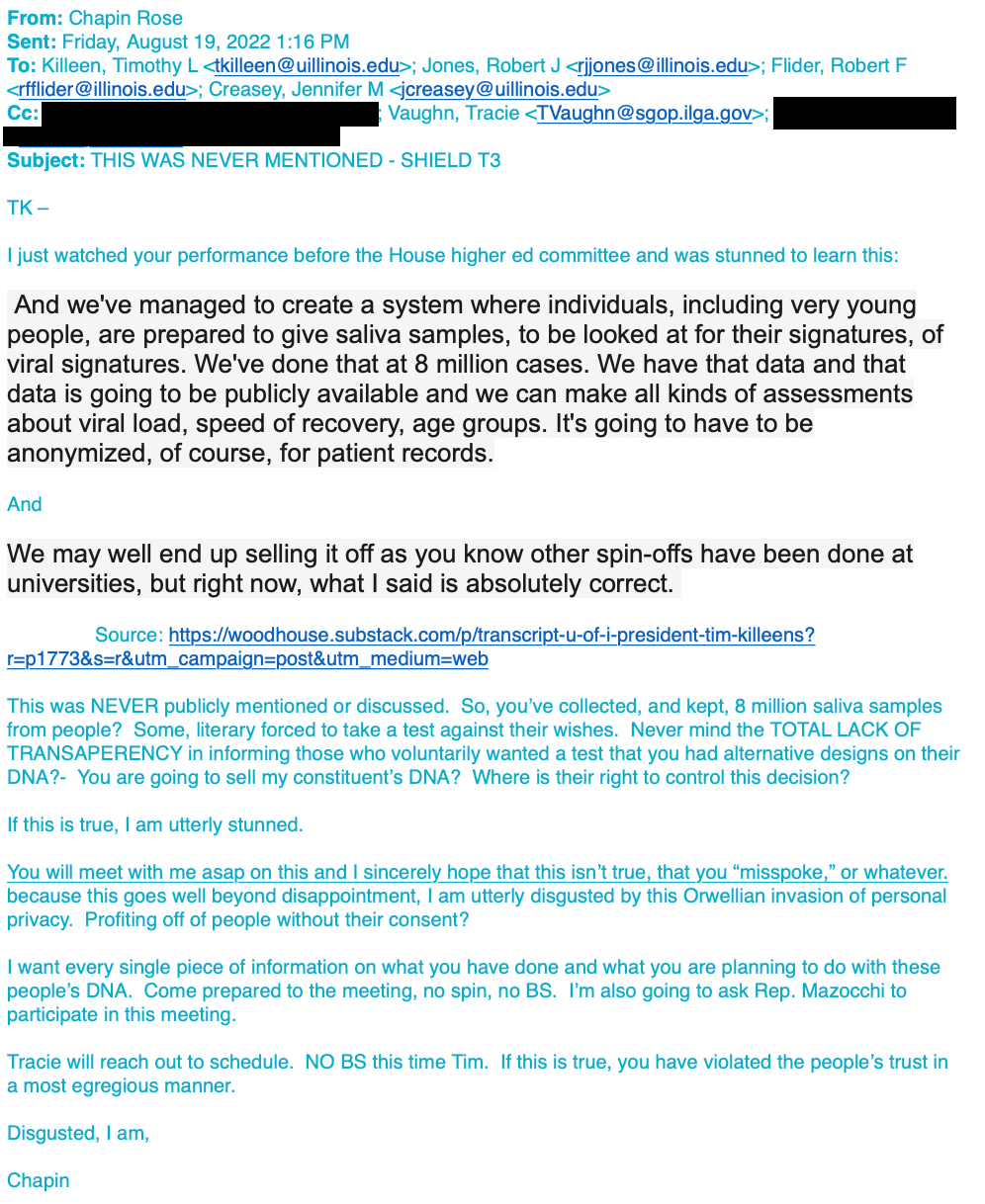 UPDATE: Dan Proft and Amy Jacobson discussed Senator Rose’s email - and the University of Illinois’ saliva-testing program - on Tuesday, August 23, 2022. Go to minute 53:00 https://omny.fm/shows/chicagos-morning-answer-with-dan-proft-amy-jacobso/august-23-2022