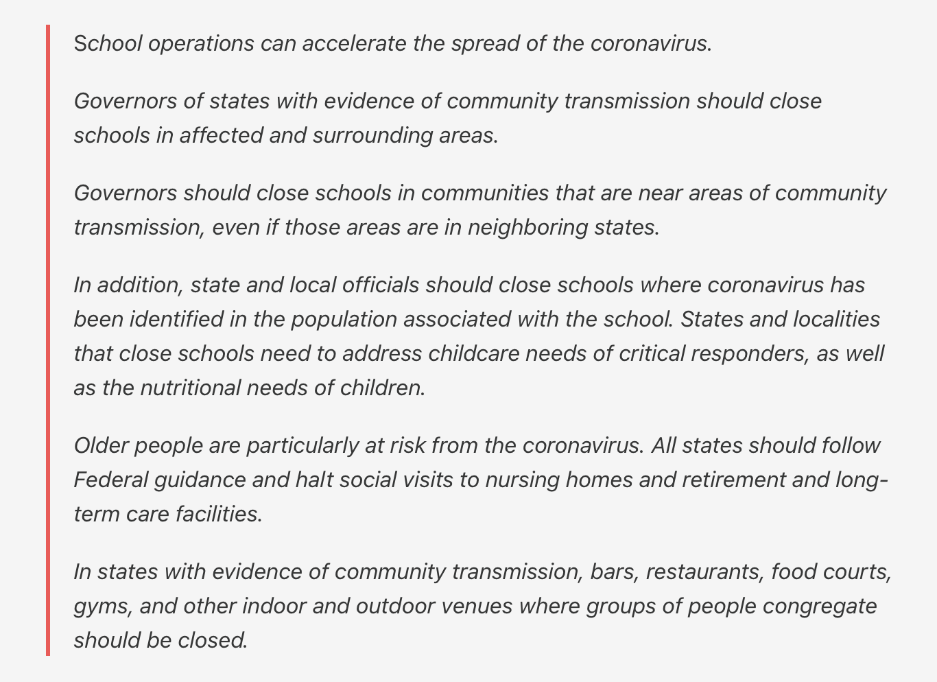 The social distancing recommendation did not shut down schools and small businesses across the country; illegal orders did that. Blaming an abstraction amounts to gaslighting. If anything unilaterally shut down these places, it was The President’s Coronavirus Guidelines for America (relevant excerpt below).