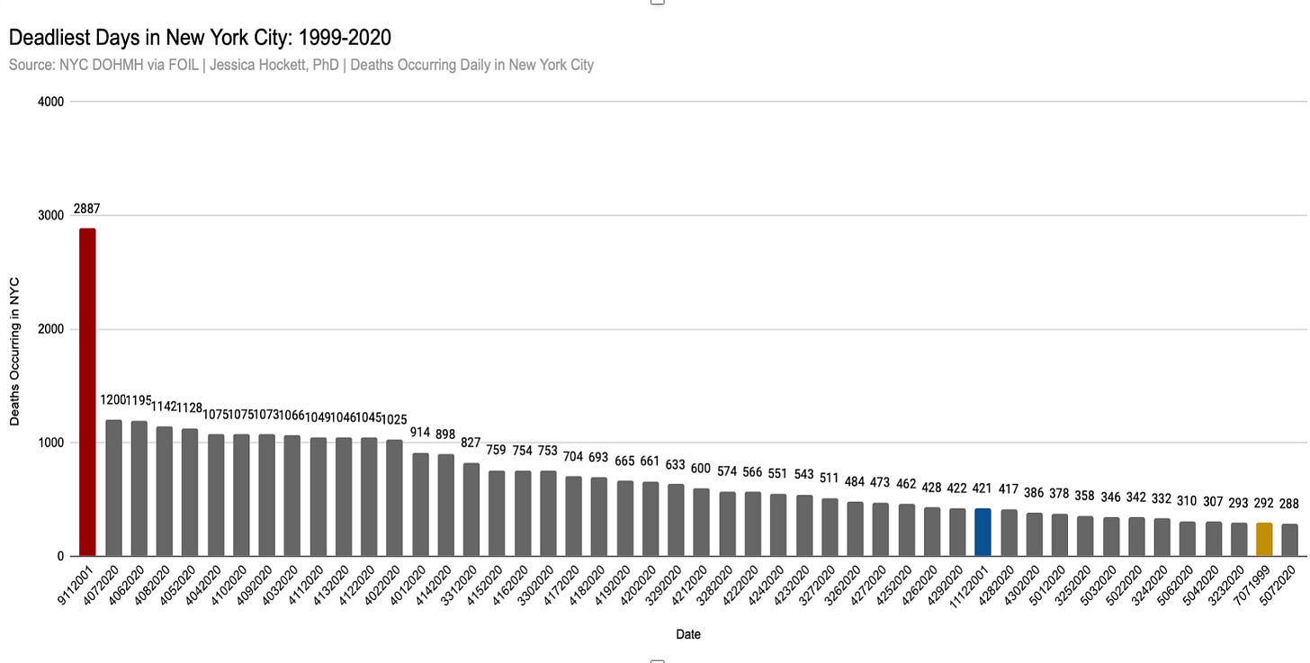 Sorting deaths per day from most to least going back to 1999 makes obvious that the city had no prior experience in recent decades (if ever) handling the number of bodies it claimed to have handled in late March and April 2020.