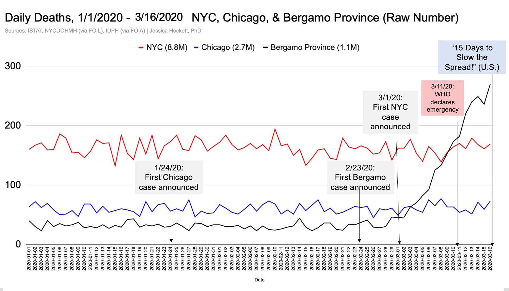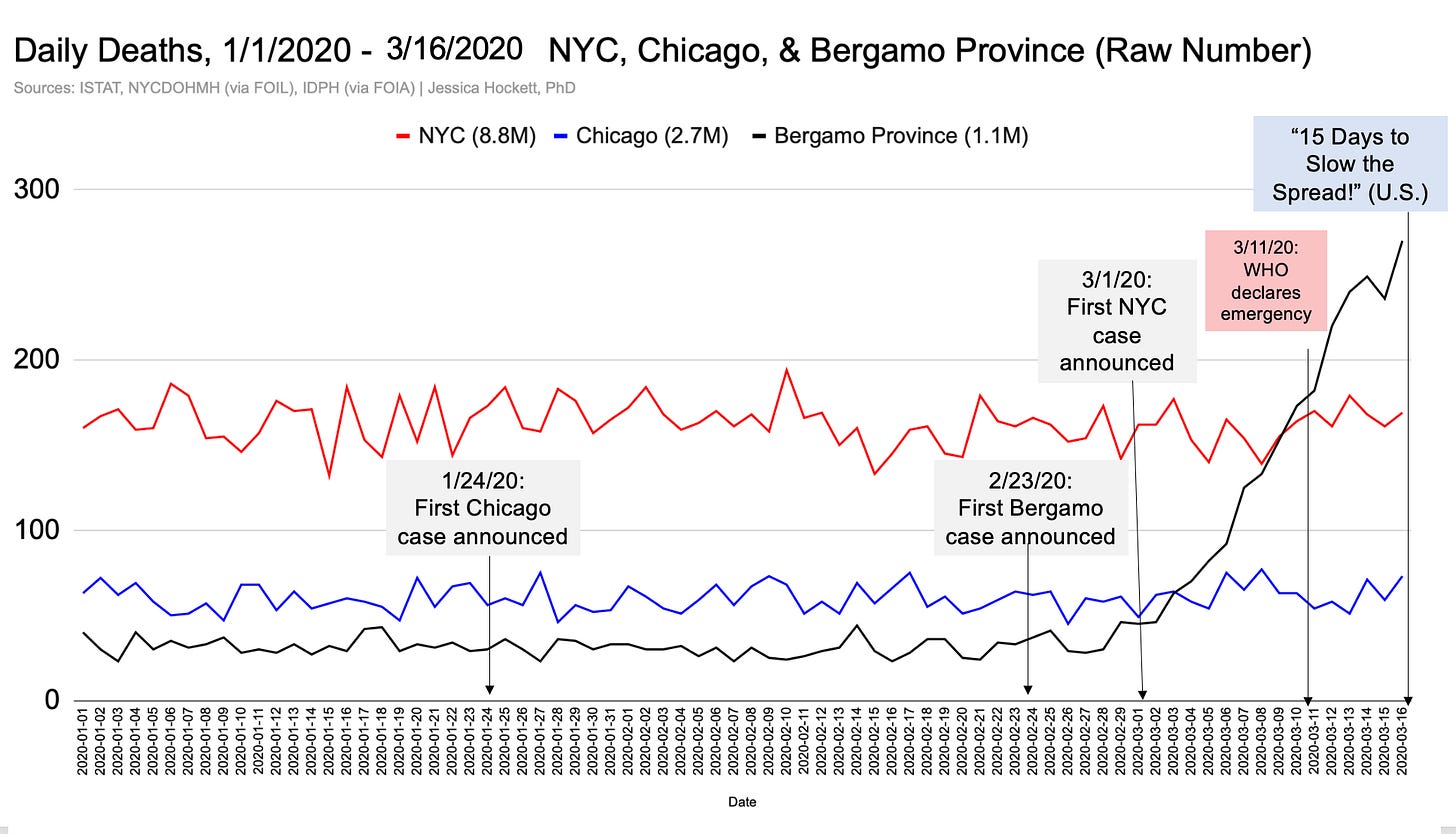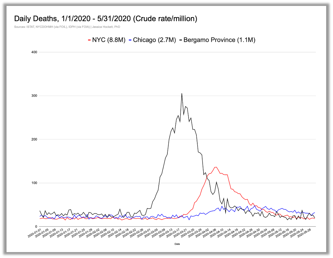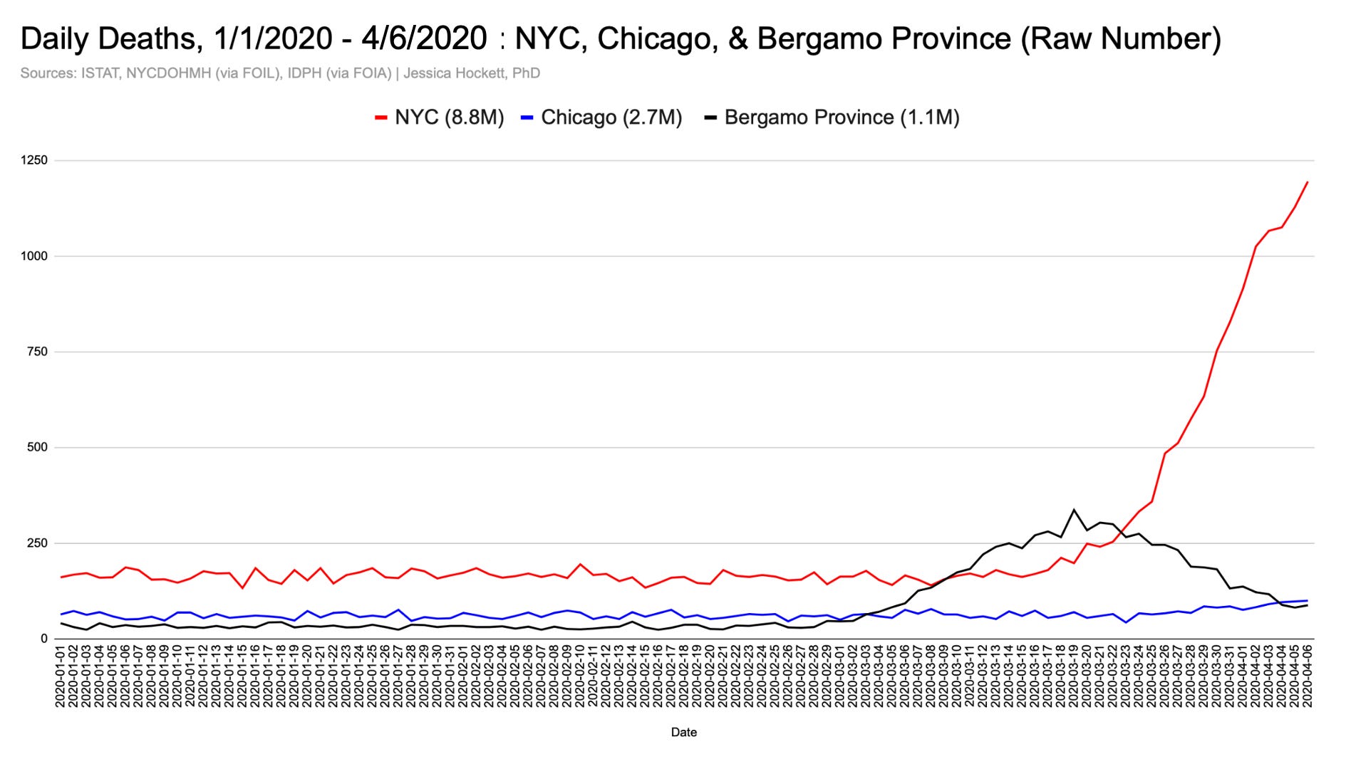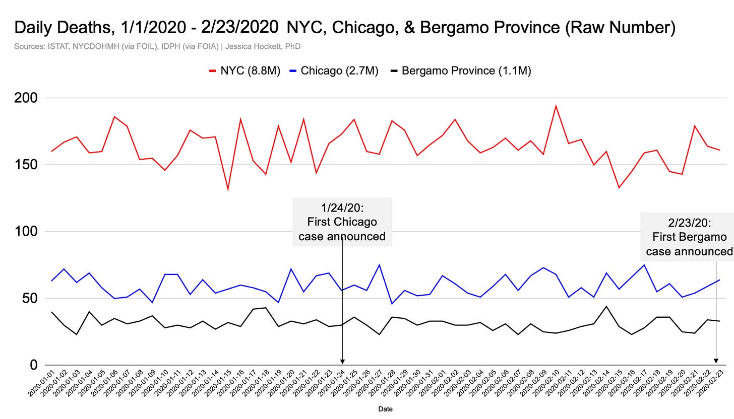 I’m left wondering how these events could involve the same “spreading” virus? What is the explanation for the differential "impact" of the purported novel deadly pathogen on daily deaths in Bergamo province, New York, and Chicago?