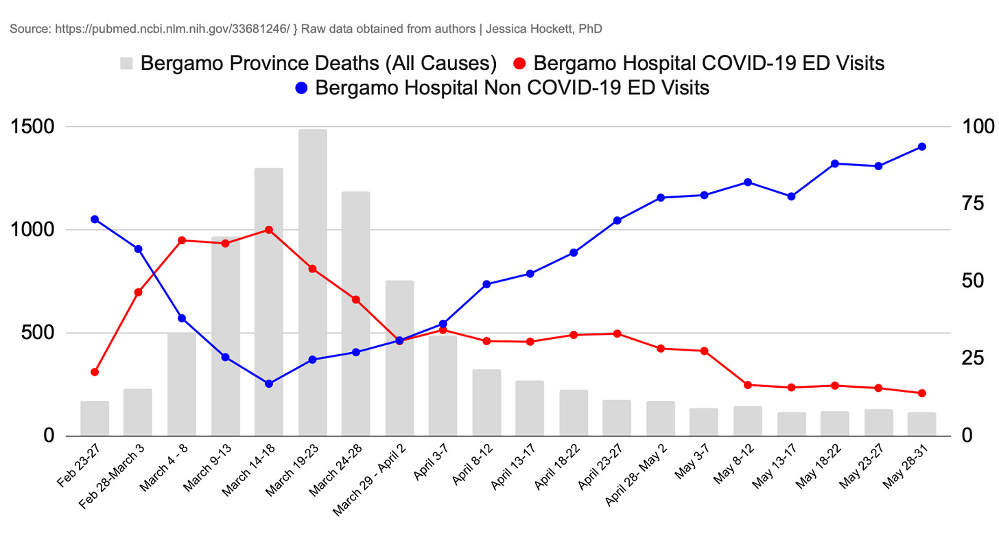 Bergamo Province, Italy. The Bergamo province is one of a number of areas in the Lombardy region of Italy that experienced early and extremely high deaths. Jonathan Engler observed that the synchronicity of spikes in the region defy what would be expected of disease spread — which should look more like a forest fire igniting and building gradually than a fireball or bomb drop. In terms of percent increase, Bergamo and other provinces in the region are the only locations which exceeded New York City’s mortality in the spring 2020 period.