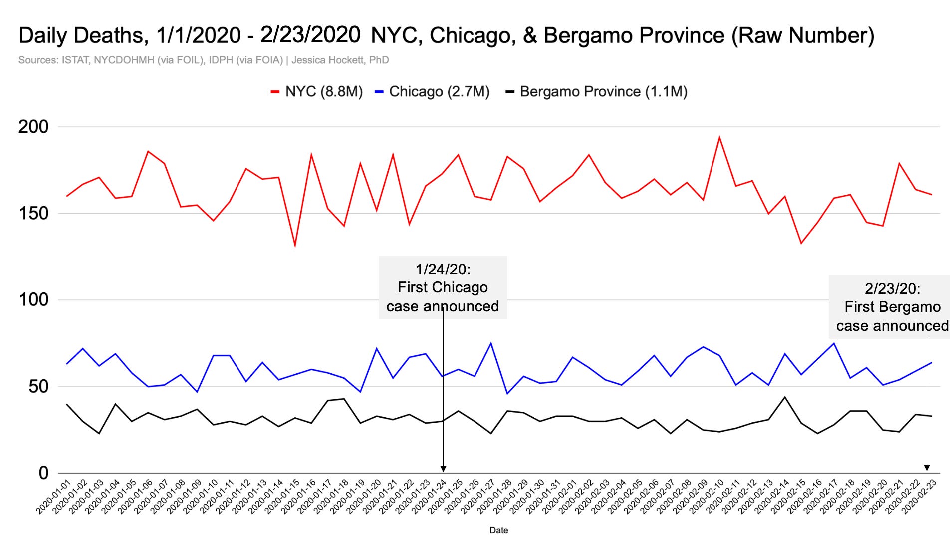 Daily deaths in Bergamo, New York, and Chicago from January 1, 2020 through February 23, 2020 are stable and show no signs of a spreading pathogen or particularly severe flu season. Chicago announced its first COVID-19 case on January 24th; Bergamo’s was a month later