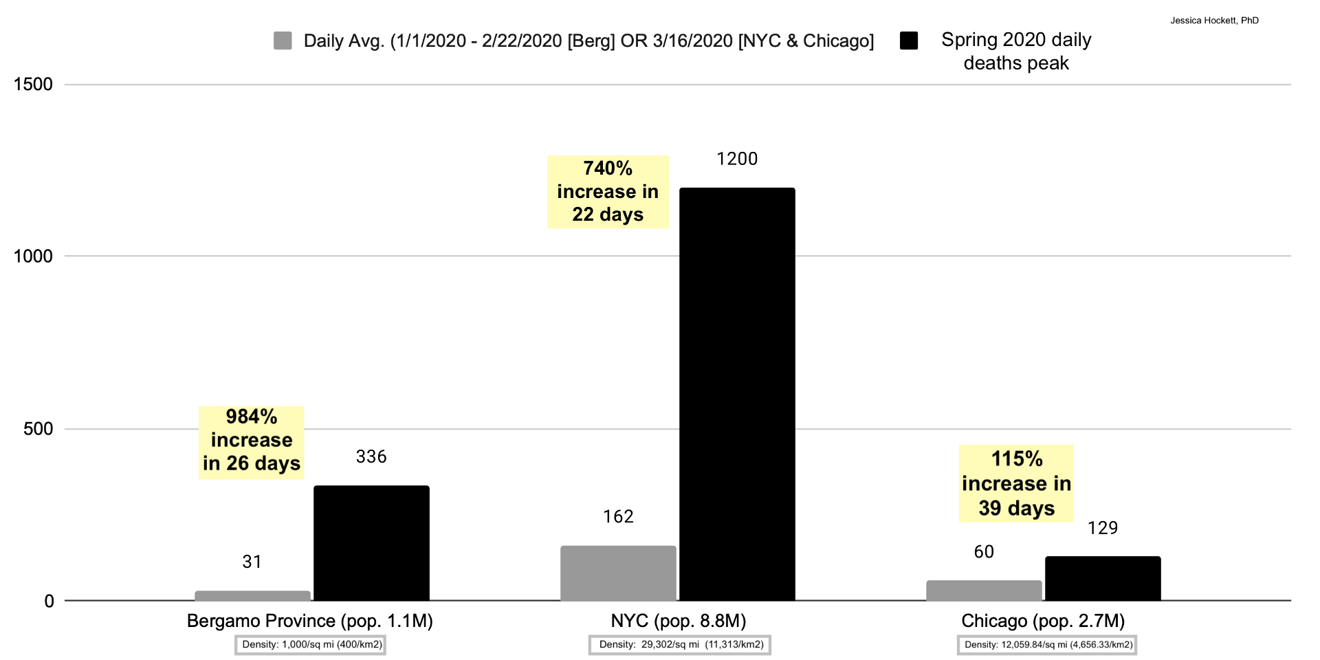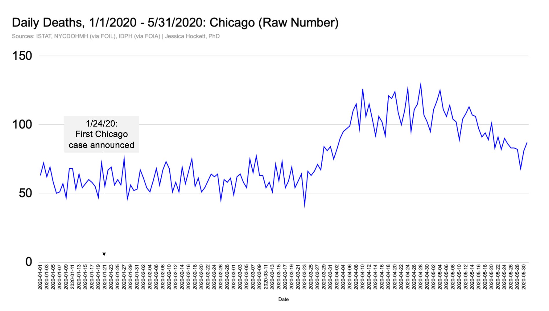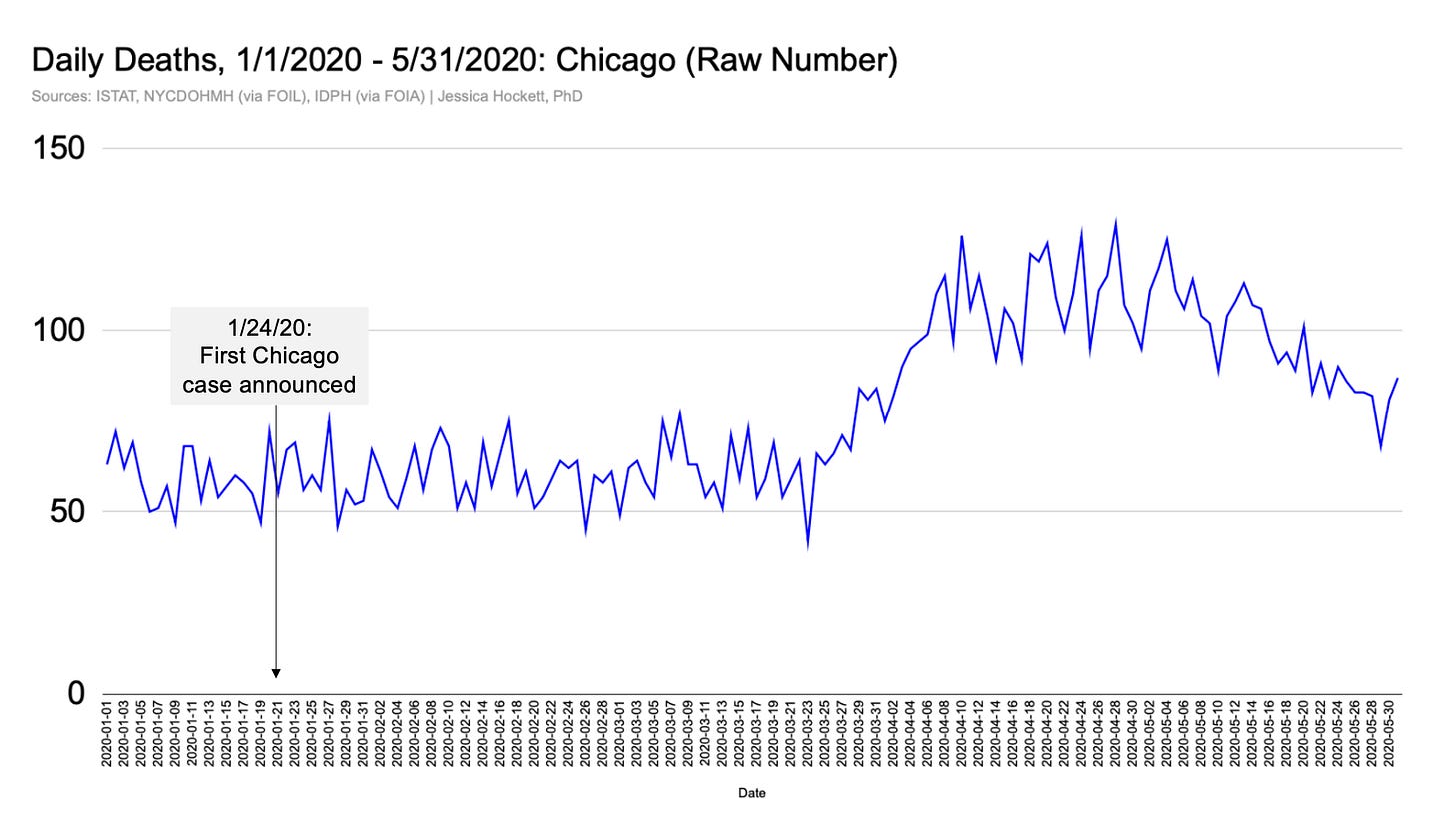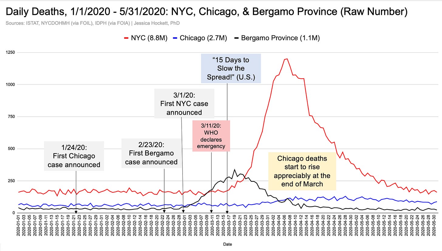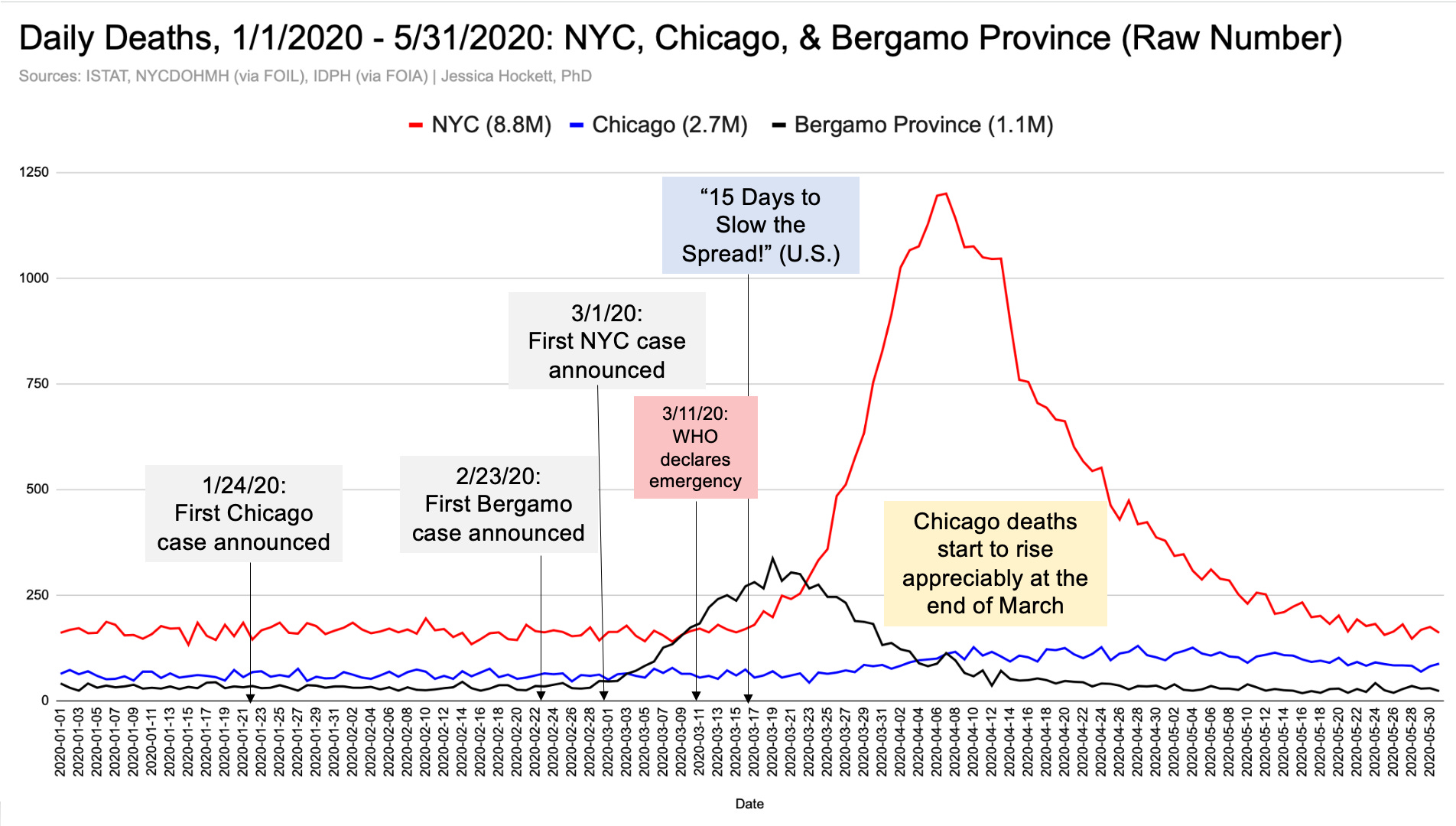 Chicago, Illinois. Chicago’s Wave 1 death increase was much lower than Bergamo’s or New York’s - and started later - despite announcing a COVID-19 case 4-6 weeks sooner than the other two cities.