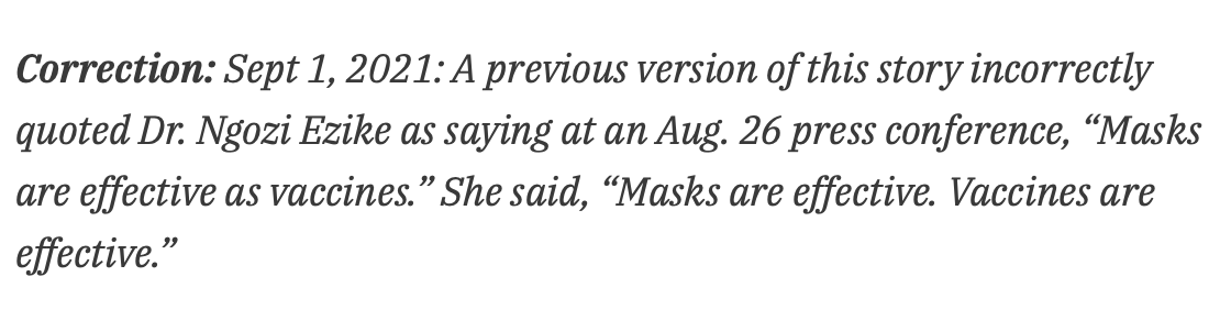 After being contacted by IDPH and at least two readers (including me), Chalkbeat Chicago has corrected an article in which IDPH Director Ngozi Ezike was quoted as saying “The bottom line is that masks are as effective as vaccines are,” during an August 26th press conference.