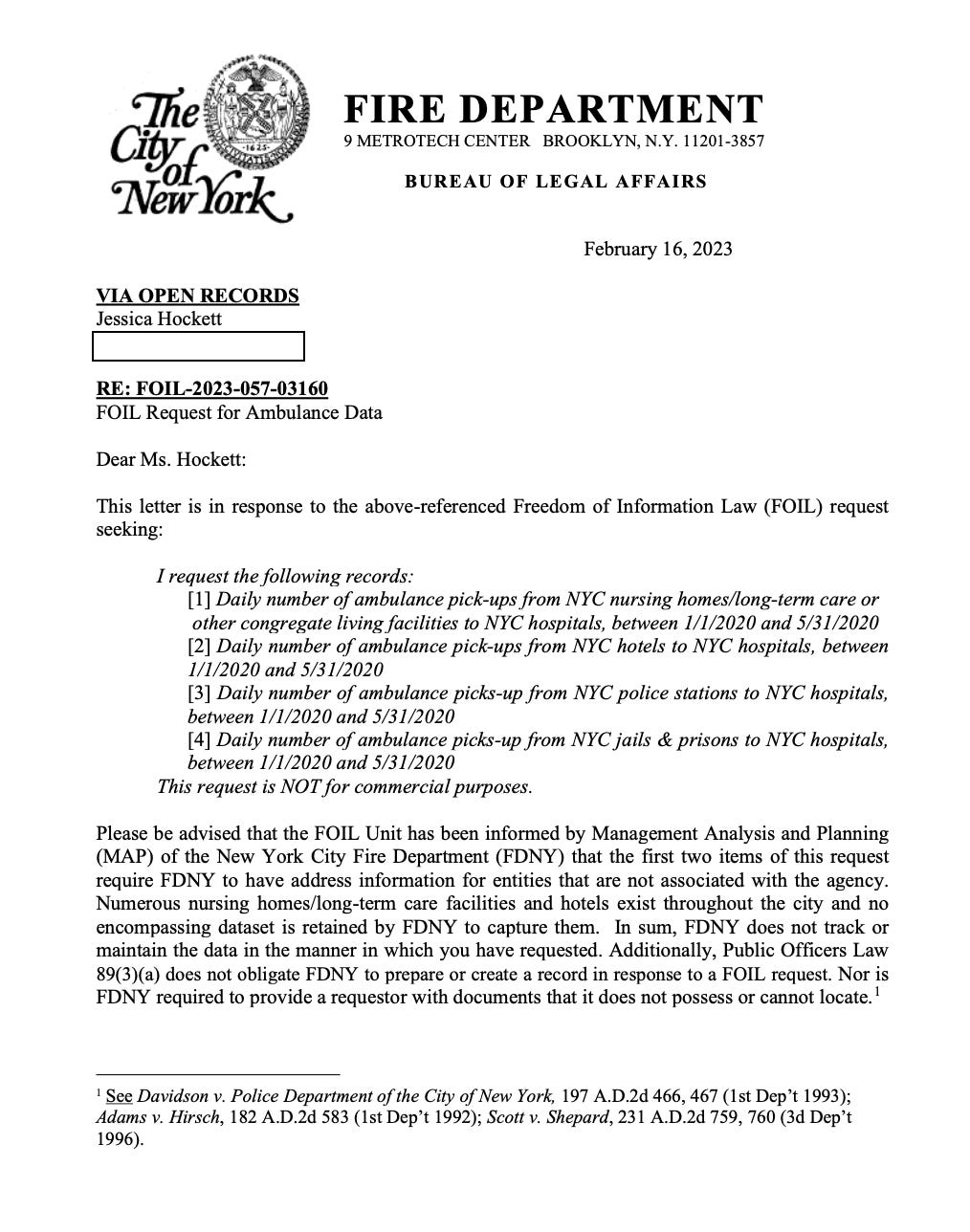 Last March, I had asked FDNY for the number of ambulance transports to hospitals from nursing homes, hotels, police stations, and jails during the first five months of 2020. They pushed my request back several times before I called and spoke with a staffer about the delay. “We have a new director for our unit,” she said, “and I just let her know that your request is outstanding for a period of time and I gave her this information so that she can start having it processed.” (She also mentioned being short-staffed.)