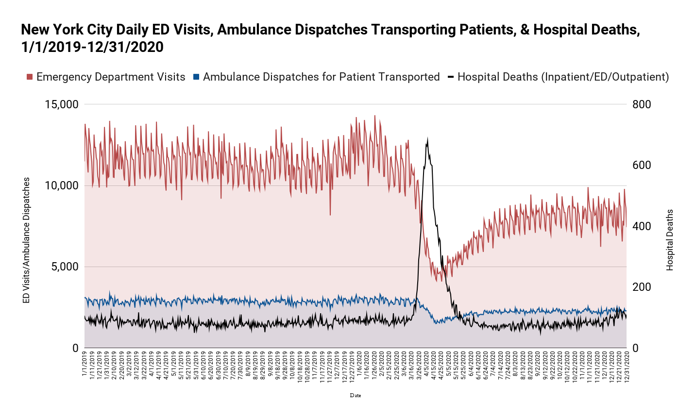 Public EMS dispatch data show a 50% drop in transports during the initial COVID-19 emergency period at nearly the same time emergency department visits dropped and hospital deaths spiked.