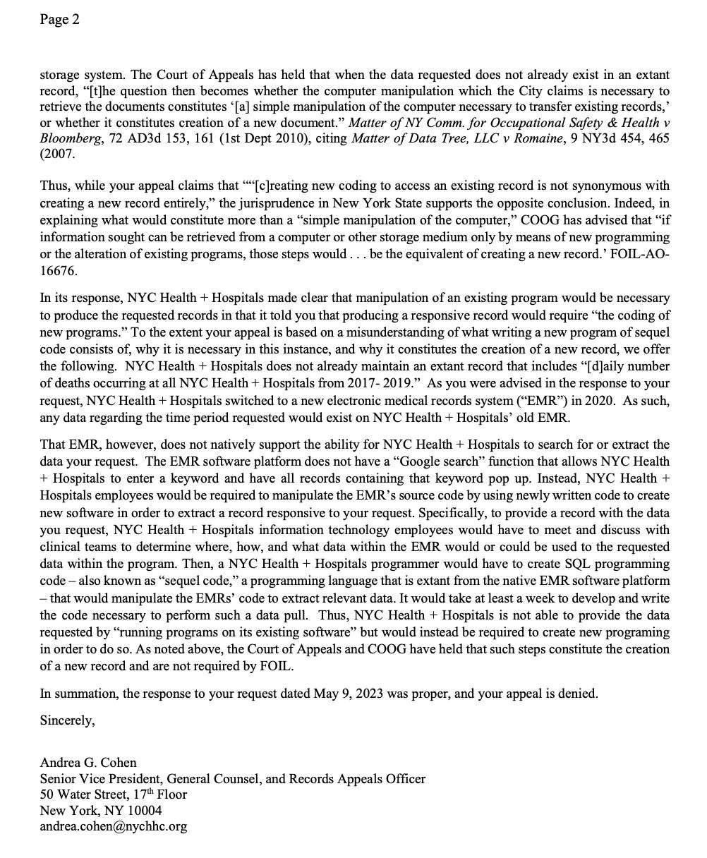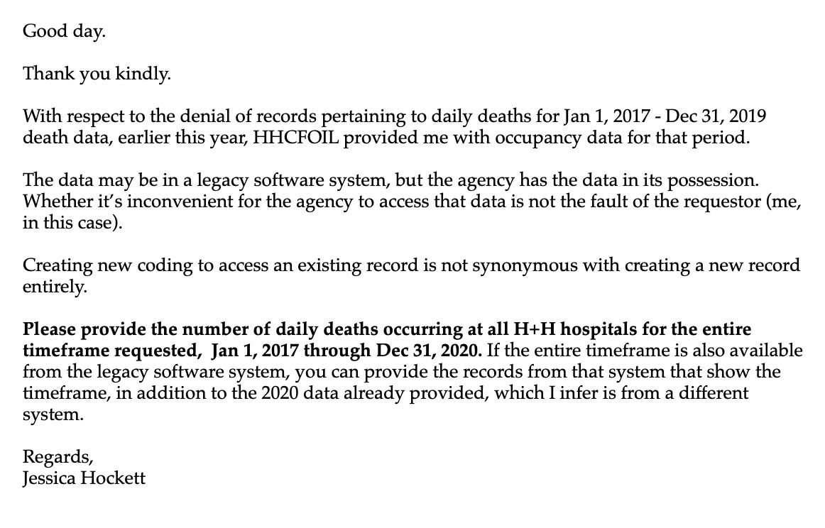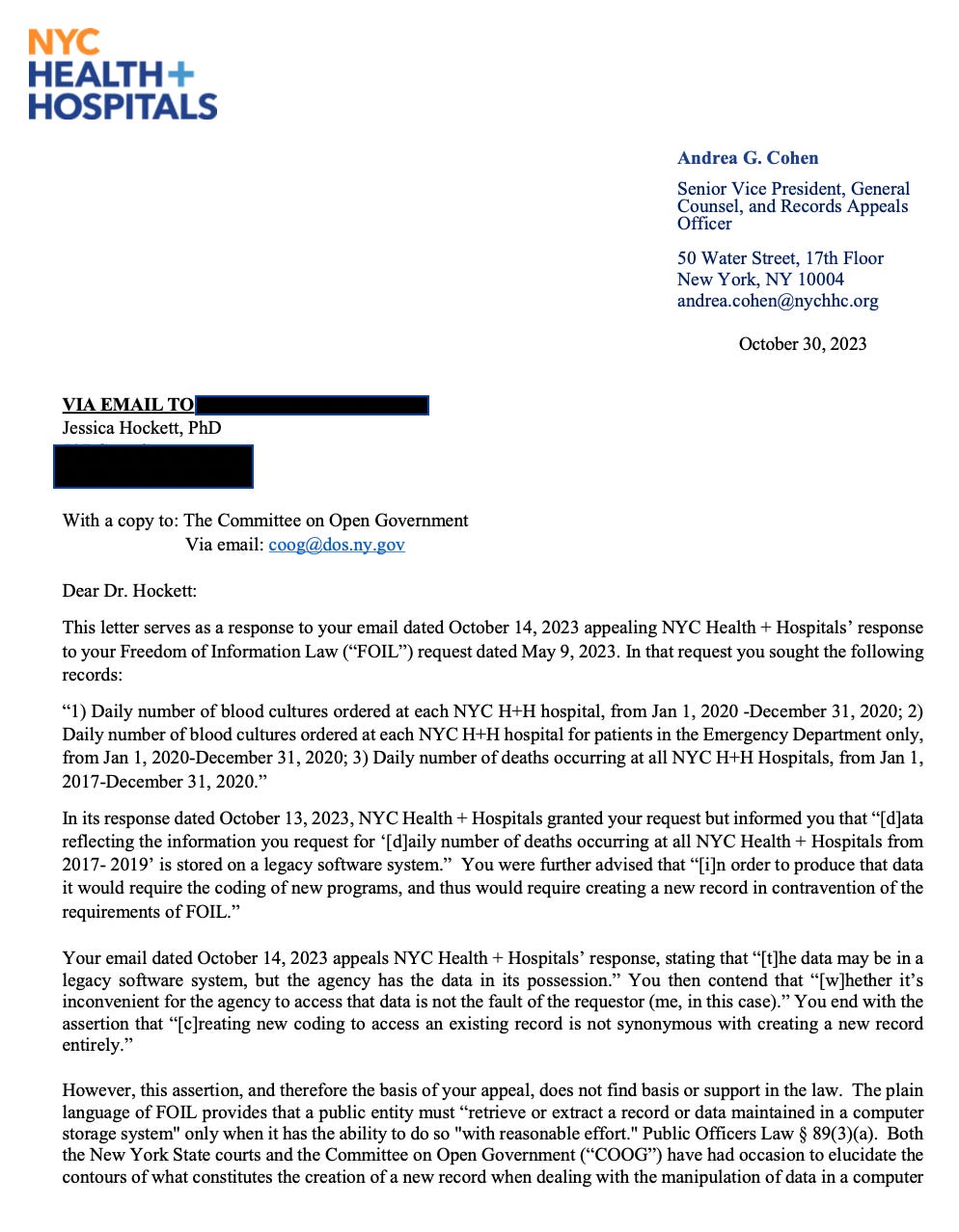Andrea Cohen, H+H general counsel and records appeal officer, responded and said record isn’t easily accessible to the agency, because it is in an old Electronic Records Management system that is no longer supported.1 To retrieve it would require the creation of new records, i.e., creating new codes, etc. (I don’t buy that excuse; you can read Ms. Cohen’s letter at the end of this post and decide whether you do.)