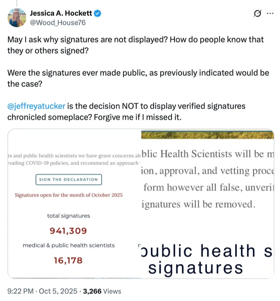 The stewards of the declaration, Brownstone Institute, evidently regard signatories as those who stand with the authors now. In my opinion, that alters the meaning of the list, if not the document.