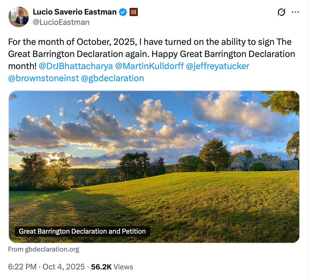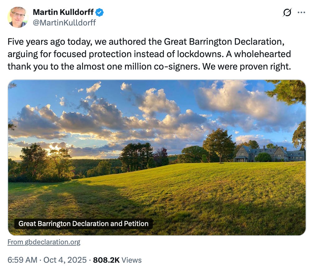 The Great Barrington Declaration wasn’t the only COVID-era “dissident document” to solicit endorsements, of course, but it remains one of the most elevated That may be due, in part, to how widely it was covered at the time by mainstream outlets such as The Wall Street Journal and The New York Times.The Brownstone Institute has also been tireless in promoting it as something of a precursor to political victory, as two of its authors now hold prominent policy roles (Bhattacharya as NIH Director and Kulldorff as ACIP Chair).