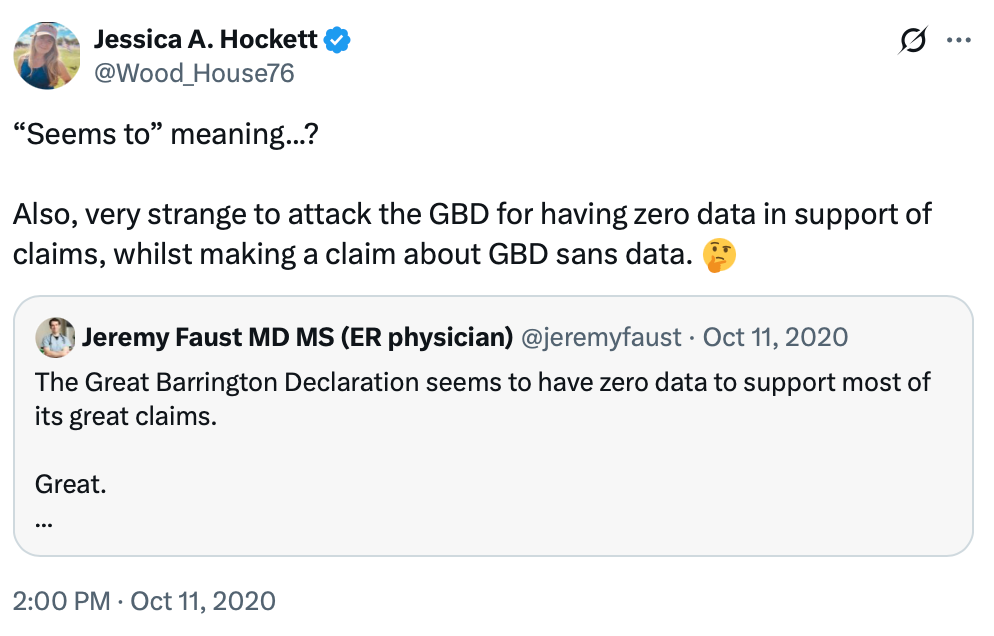 It also suggests that Bhattacharya, Gupta, and Kulldorff continue to stand by what they wrote and aren’t willing to revisit the document or consider where they might have been mistaken, in view of newer, better evidence.