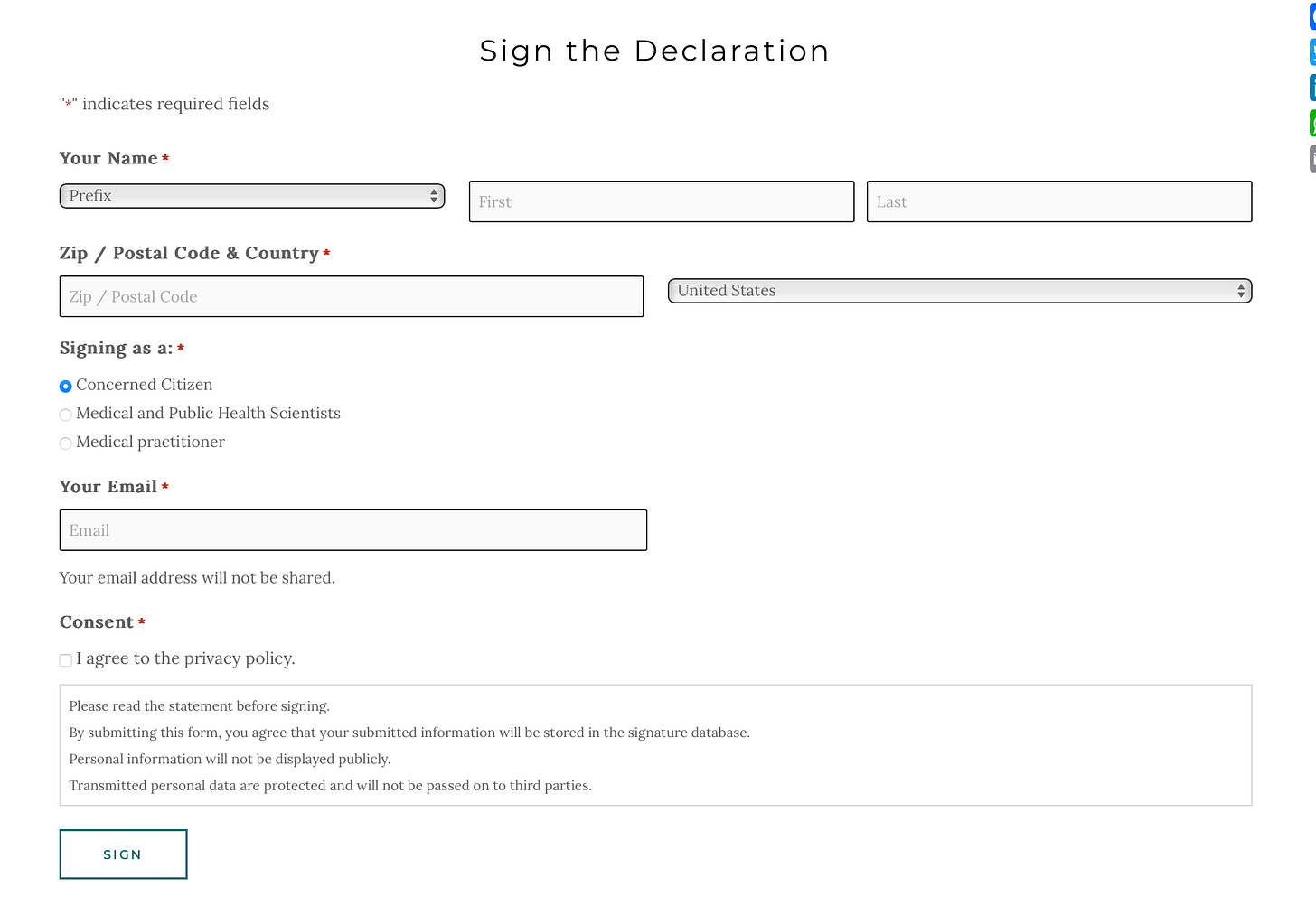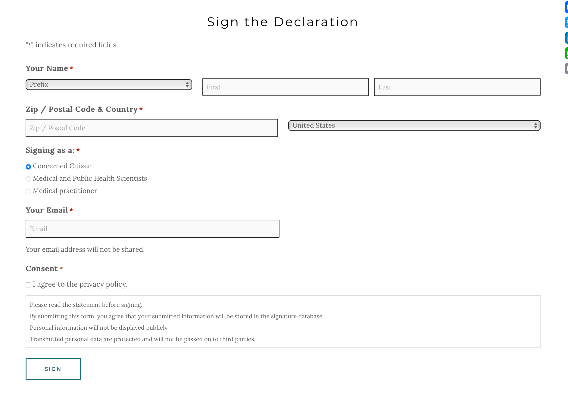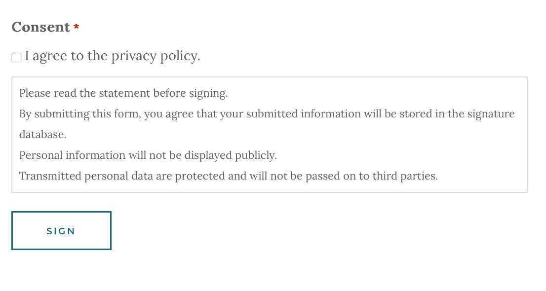 Per the consent portion of the signature form, submitted information is stored in a database, protected in some way, and not passed on to third parties. Whether the statement “Personal information will not be displayed publicly” is supposed to apply to the signer’s name isn’t clear. That all but a few names aren’t featured on the site suggests it does.