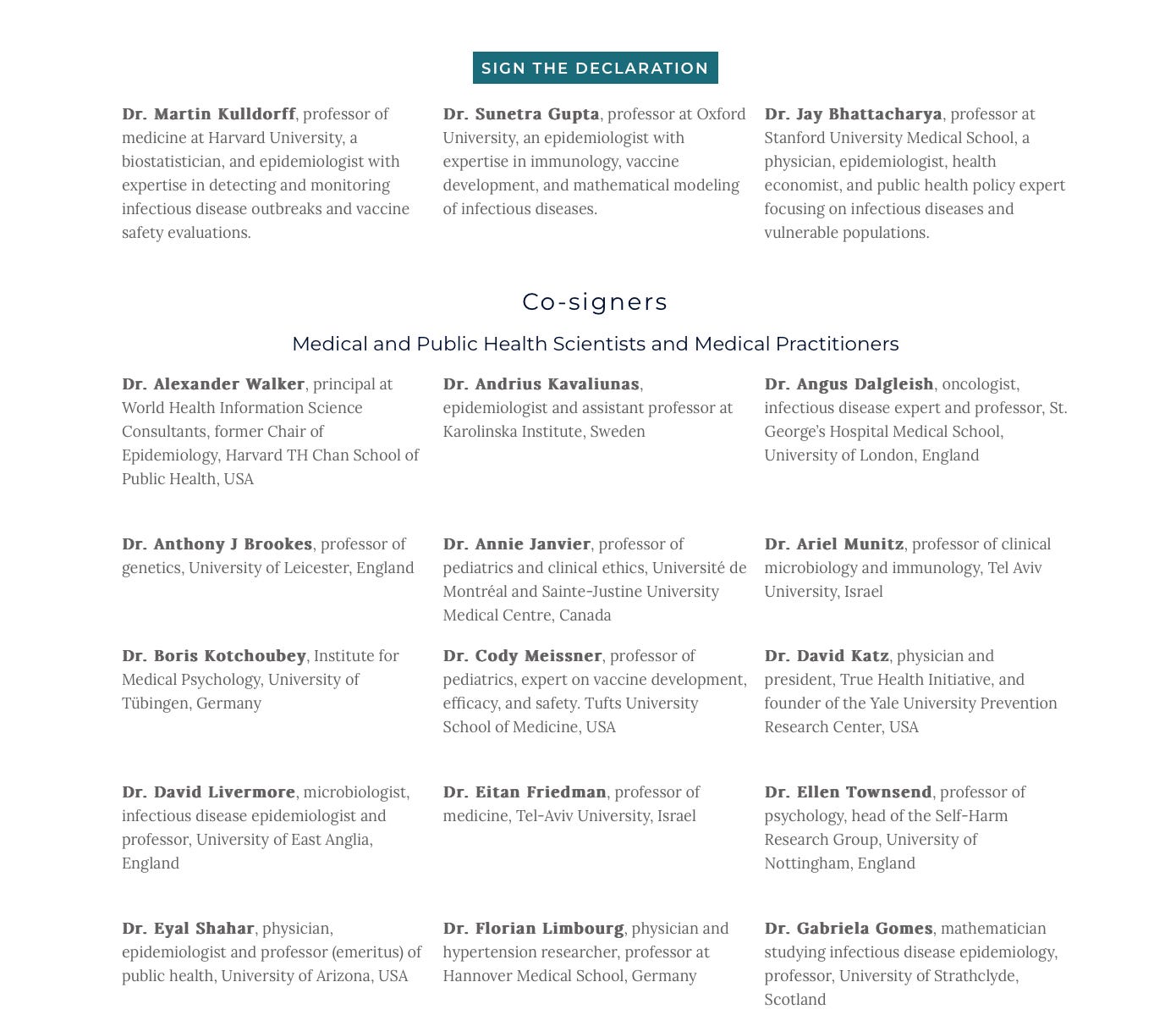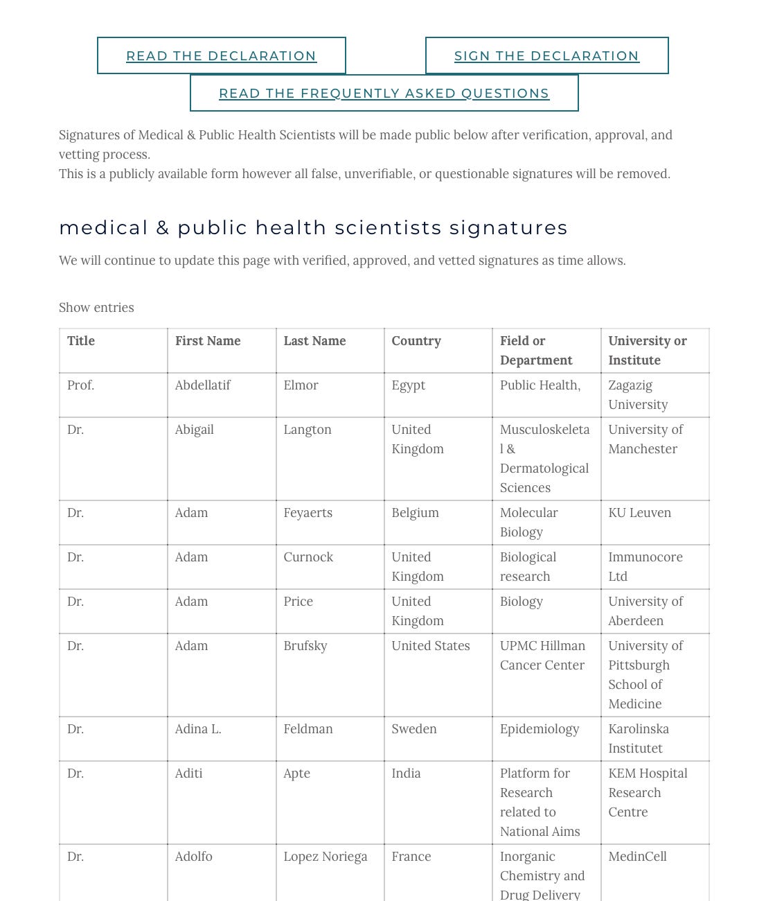 But iterations of the site in 2021 feature the signatures of other “verified, approved, and vetted” medical and public health scientists too. Where did those go? Is there a way for those and all signatures to be displayed?