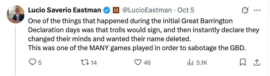 Hours after his email, Eastman reminisced on X that during the first days of the Great Barrington Declaration, “trolls would sign and then instantly declare they changed their minds and wanted their name delete. This was one of the MANY games played in order to sabotage the GBD.”