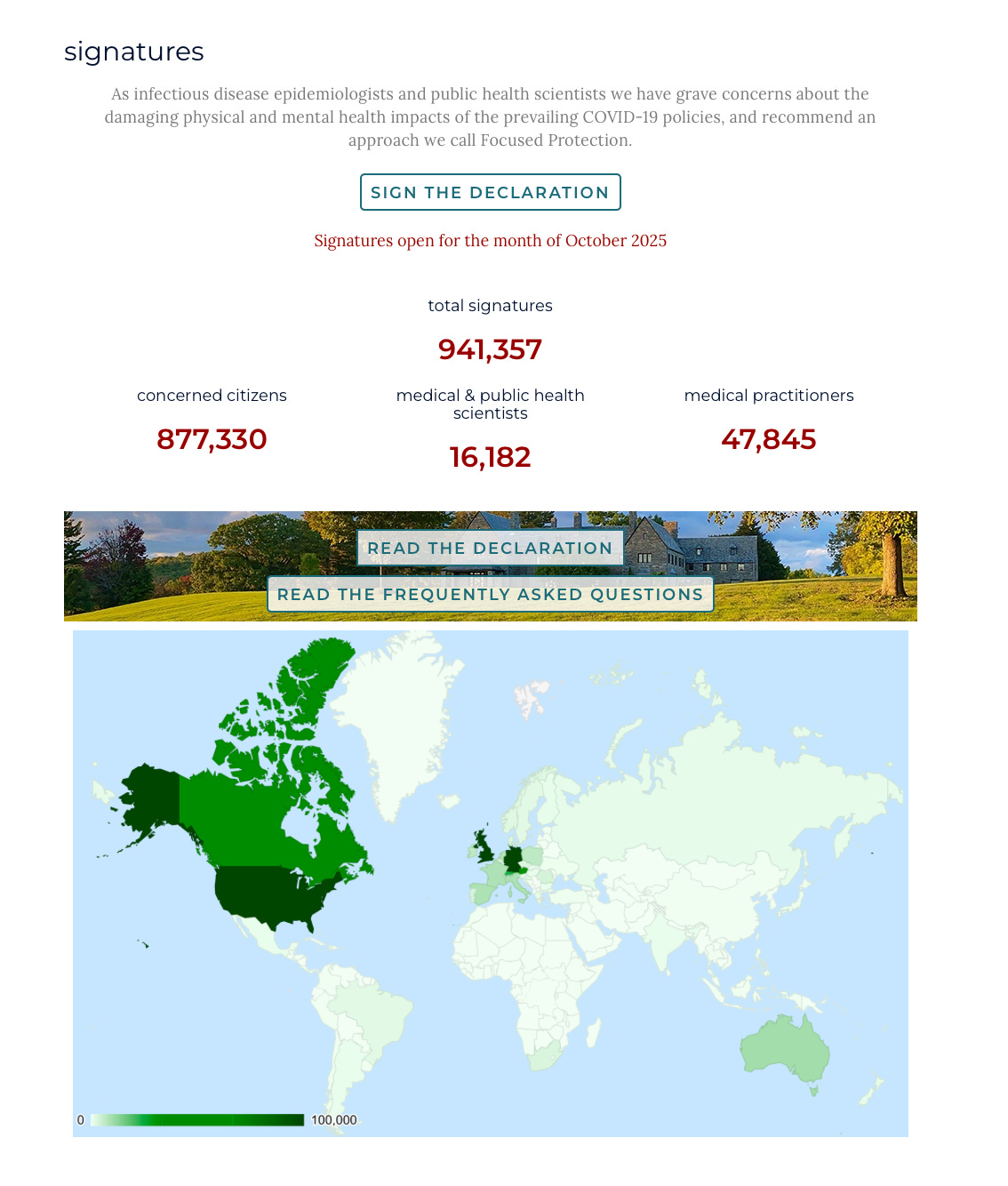 On the current GBD site, signers are grouped by “type” — concerned citizens, medical/public health scientists, and medical practitioners — and displayed on a map by country. Most signatures come from the U.S., U.K., and Germany.
